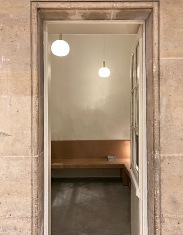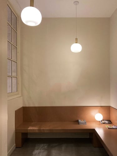 Rénovation d'un ancien local de stockage en un espace d'attente pour les visiteurs et conception du mobilier.