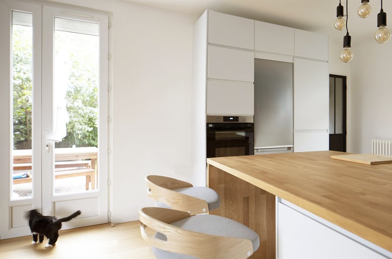 Rénovation complète d'une maison de ville. La cuisine a été repensée et agrandie, le salon a été réorganisé, un nouvel escalier a été conçu et les combles ont été modifiés afin d'accueillir trois chambres et une salle de bain.