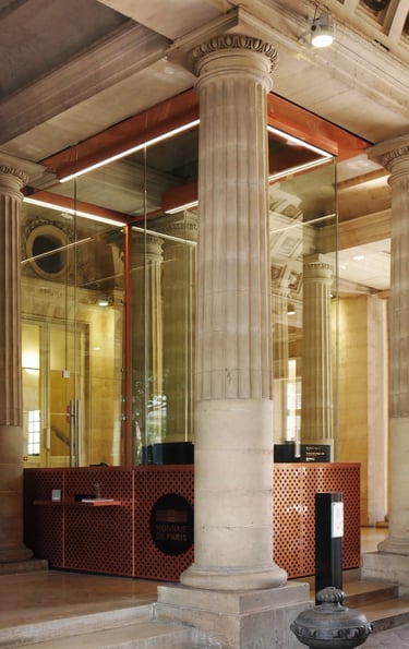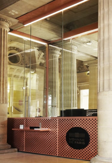 Création d'un pavillon d'accueil dans le grand vestibule d'entrée de l'Hôtel des Monnaies à Paris, classé au titre des Monuments Historiques.
