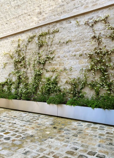 Les matériaux utilisés sont des pavés parisiens de réemploi, de l'inox brossé pour les jardinières.
